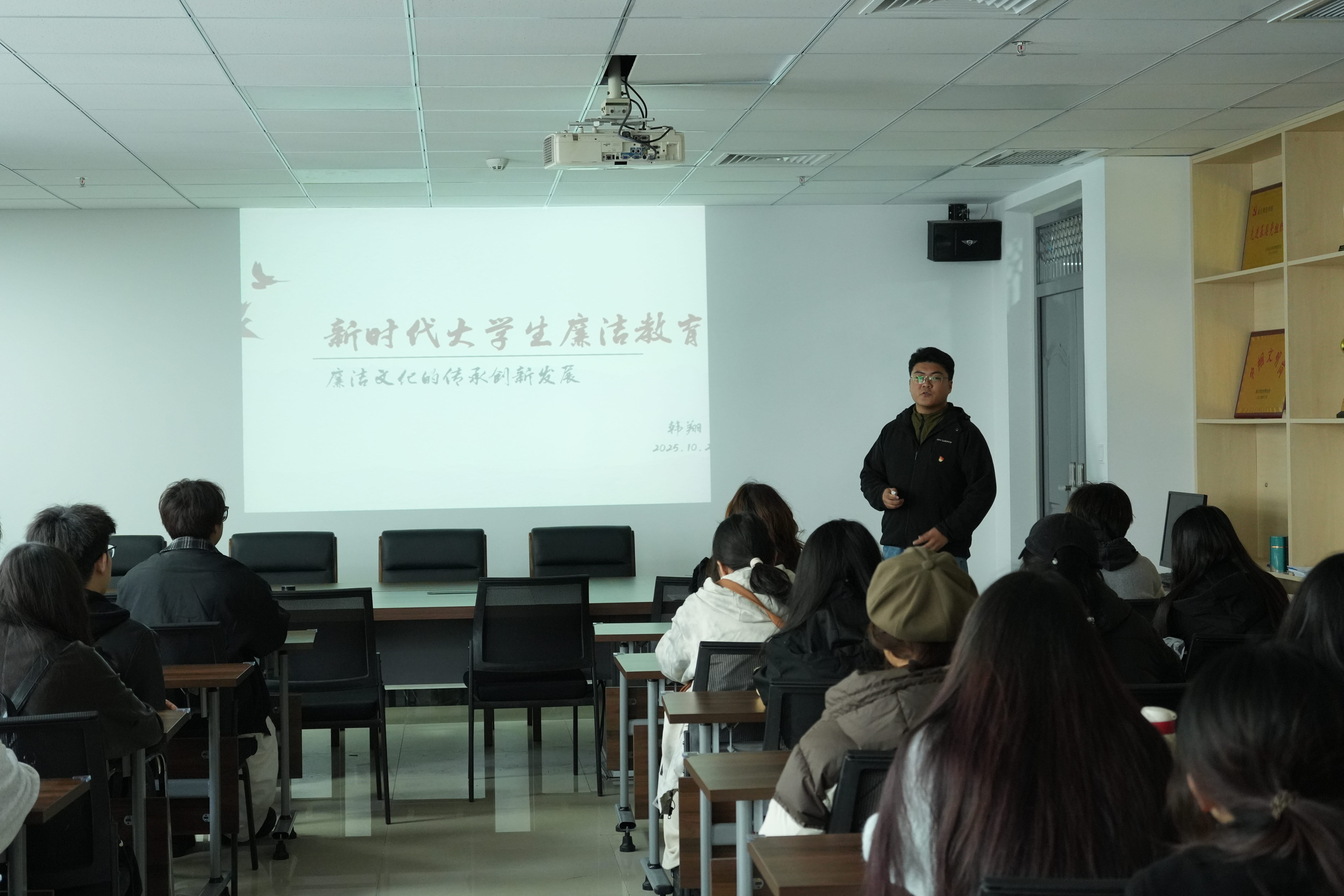 10月23日,学生第一党支部书记韩翔以“廉洁文化的传承创新发展”为主题,引用经典名句阐释廉洁内涵,结合违纪案例强化警示,从多维度明确廉洁践行路径,引导入党积极分子“扣好人生第一粒扣子”。