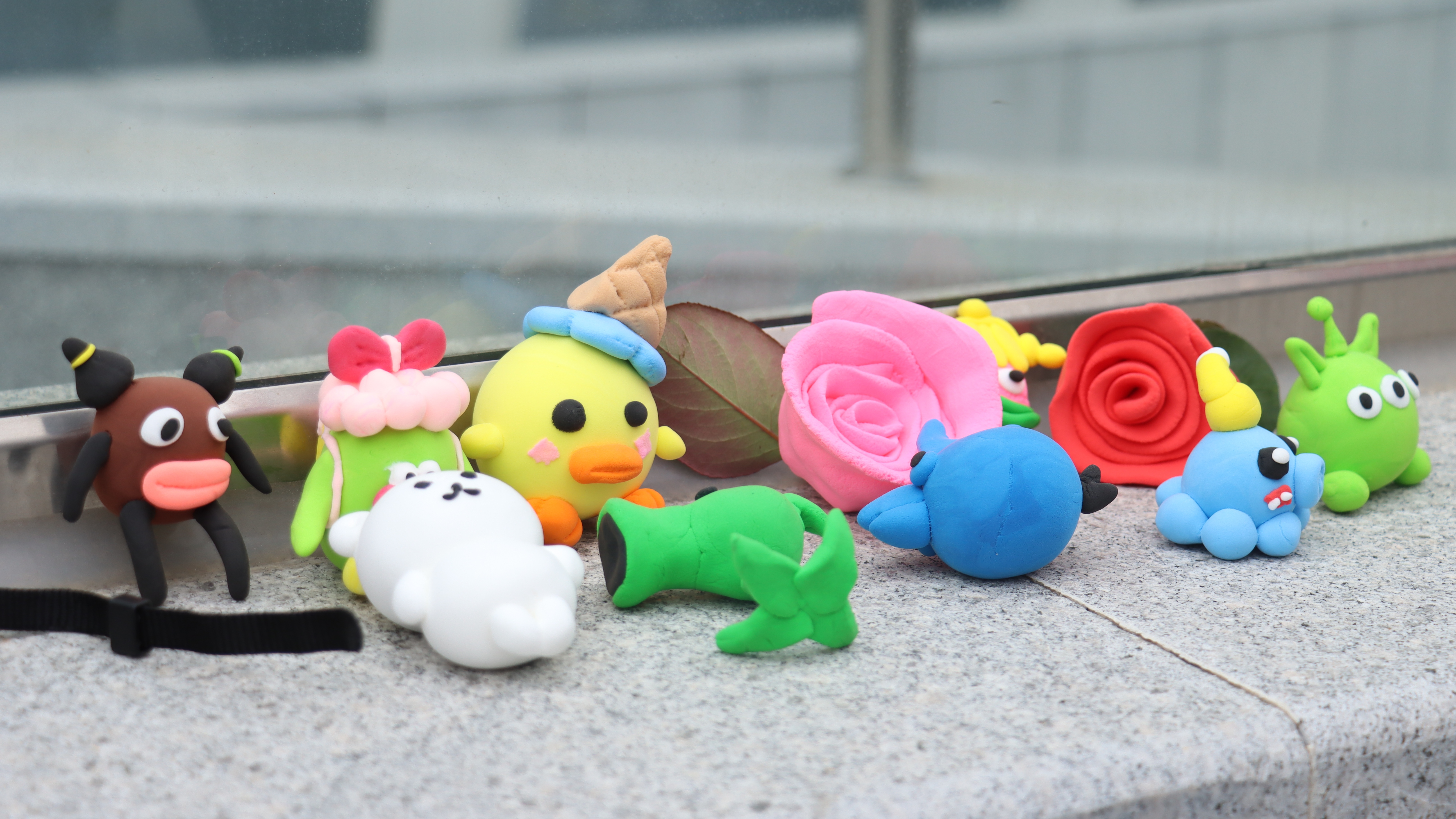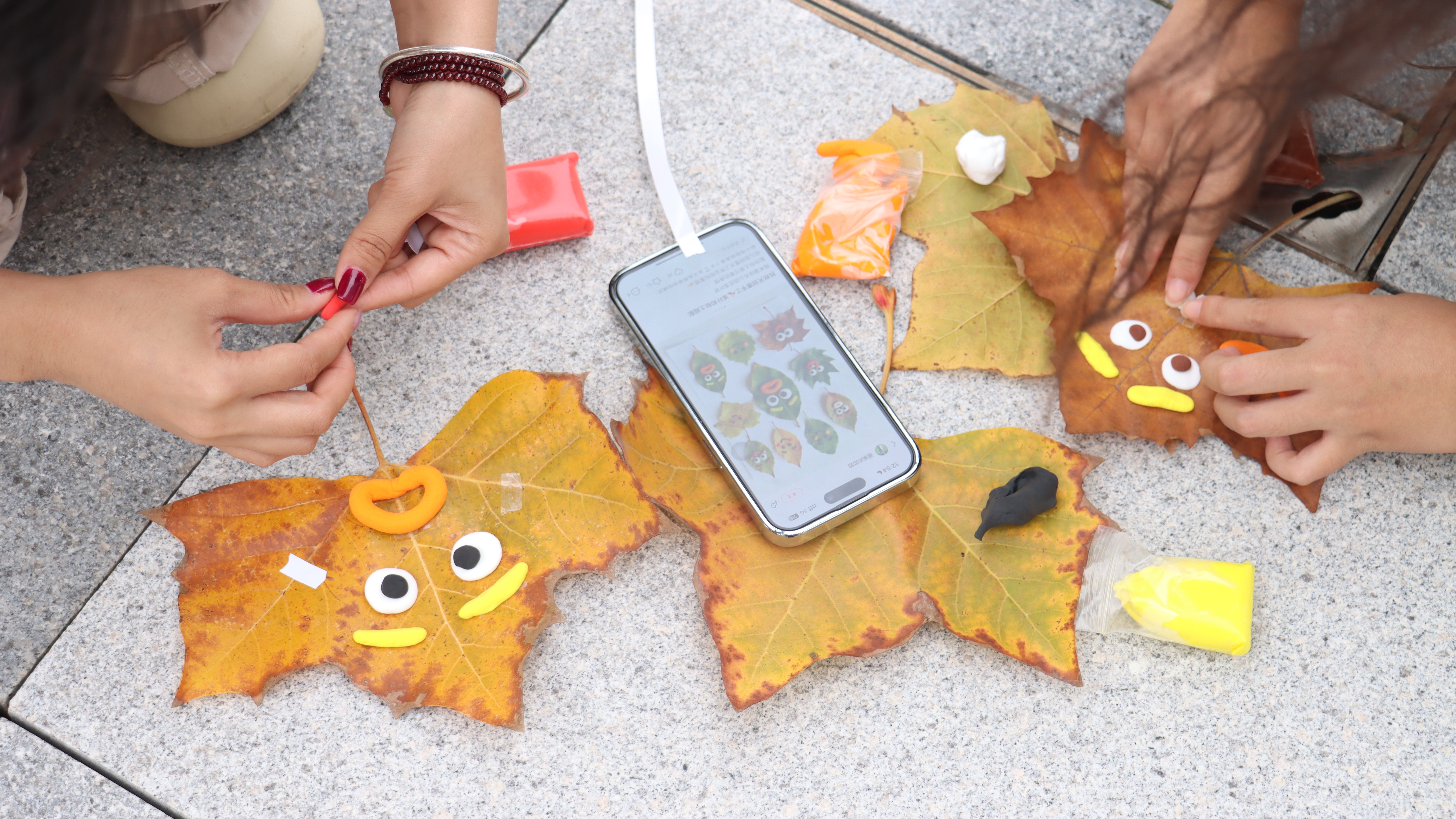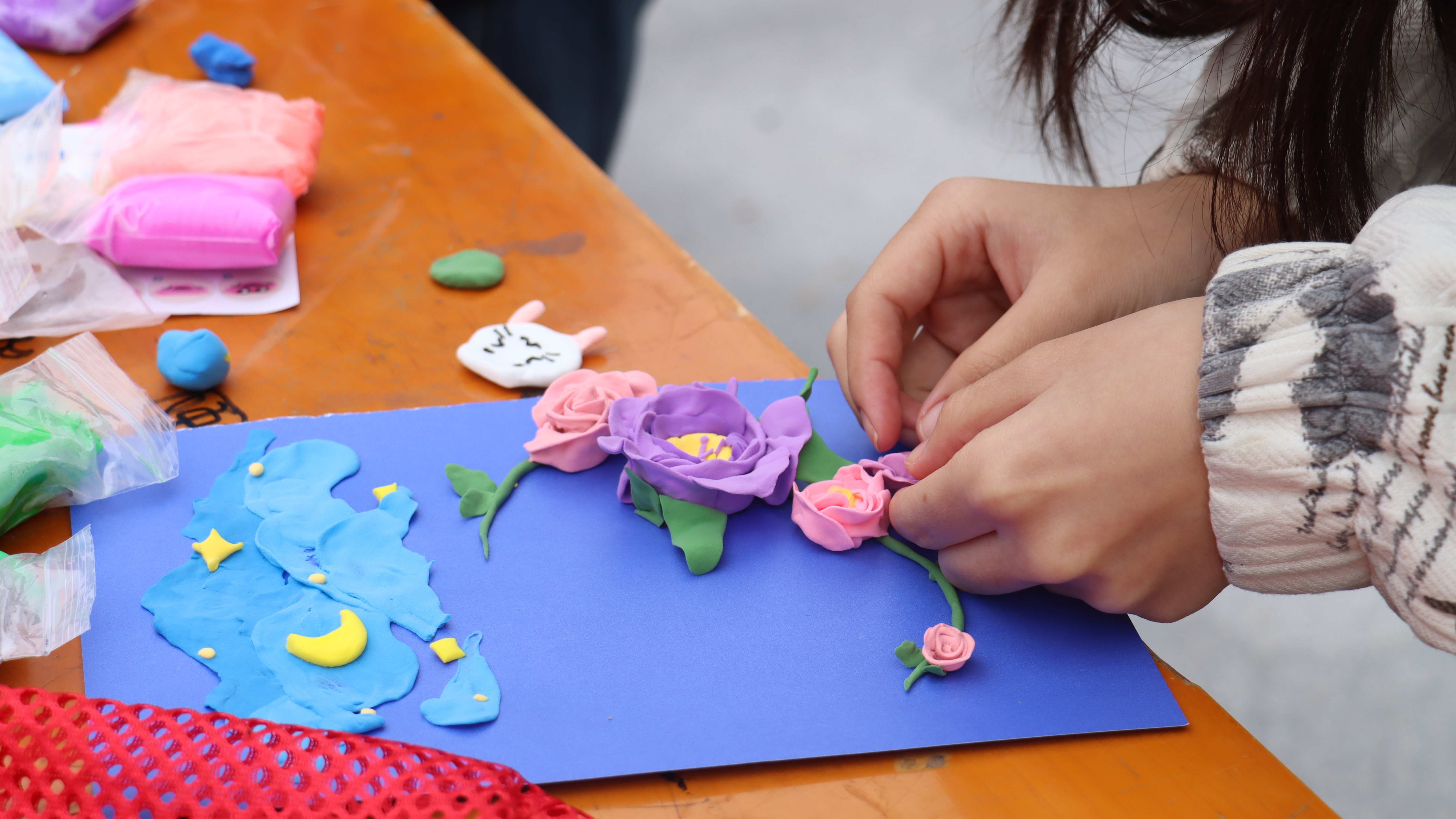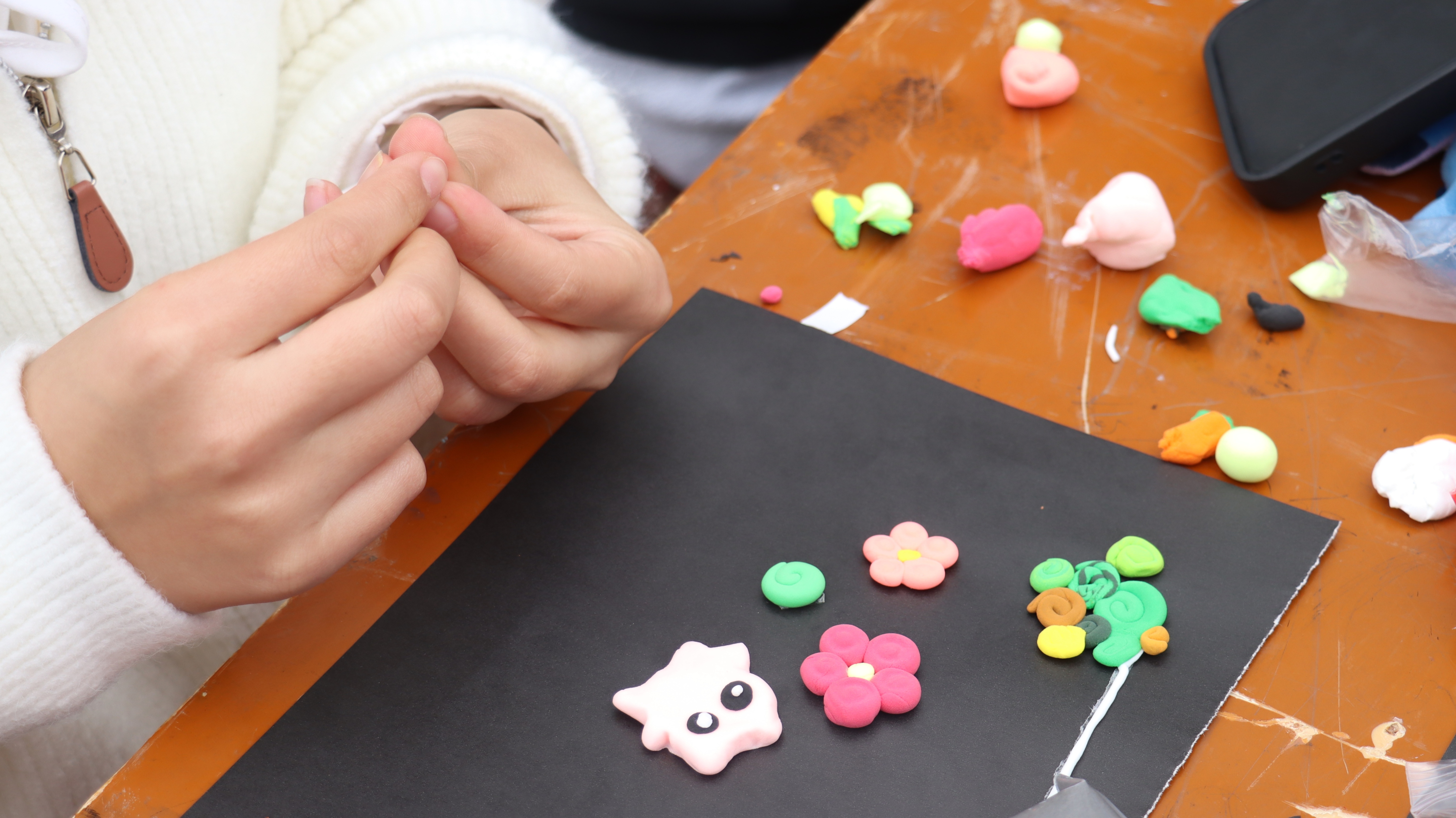 活动围绕“艺术疗愈”主题设置了三大手工区:“秋日干花手账本制作”区,引导学生将银杏、勿忘我等秋日元素融入纸页,以文字与装饰记录心境;“情绪解压肌理画”区,通过颜料与刮刀的碰撞,在画布上勾勒情绪纹理;而“治愈系黏土摆件创作”区,则以童趣造型将抽象情绪化为立体形象大家纷纷动手捏制,热情高涨。