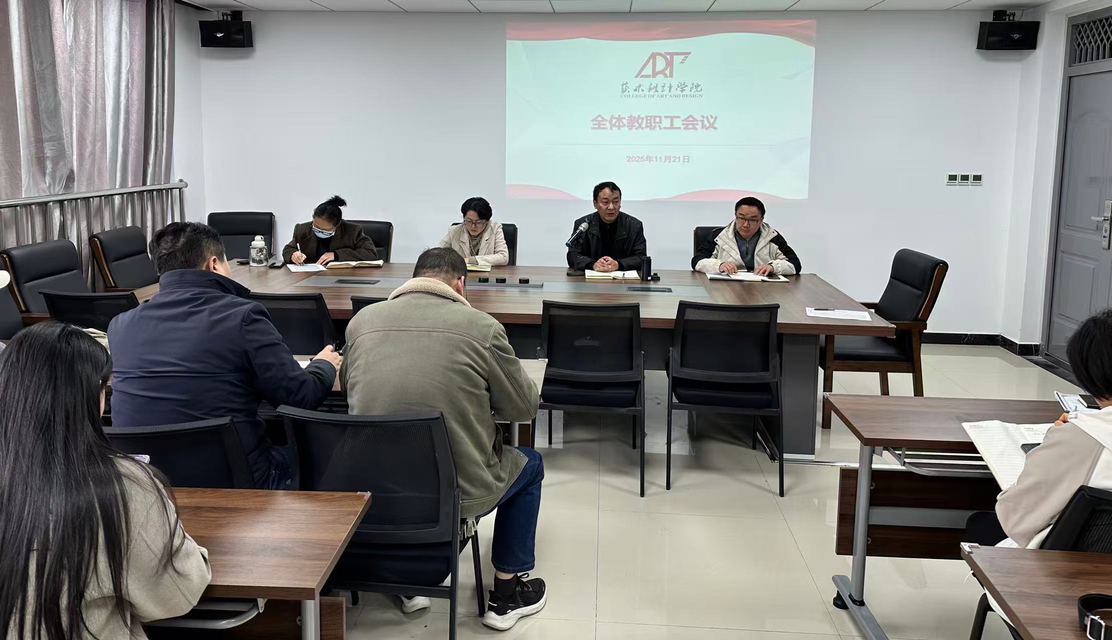11月21日,我院在艺术中心308会议室召开全体教职工会议,学院领导班子与全体教职工共同参会。会议由学院党委书记杨莹莹主持。