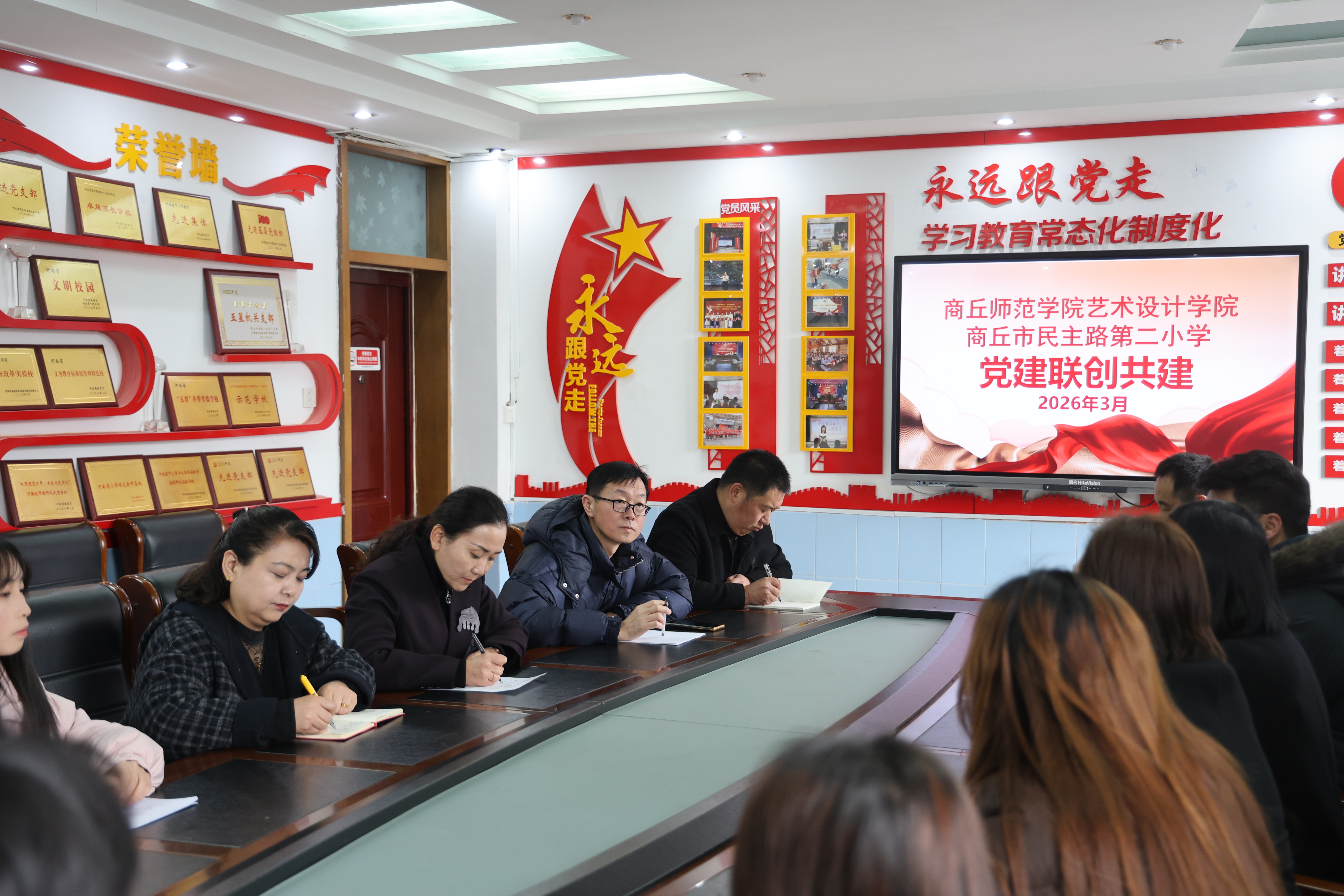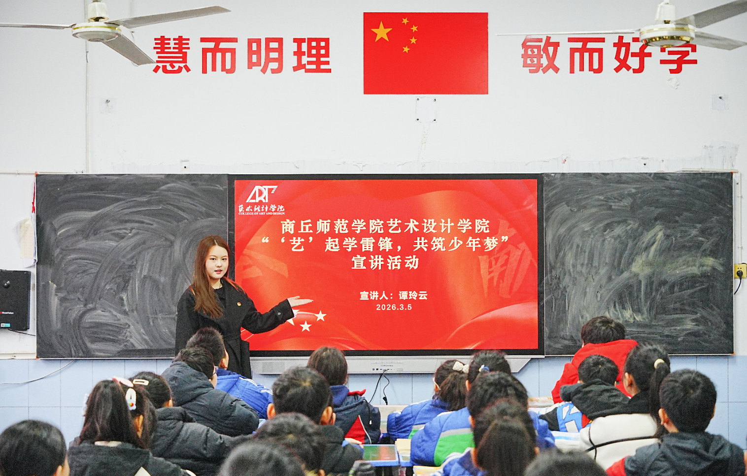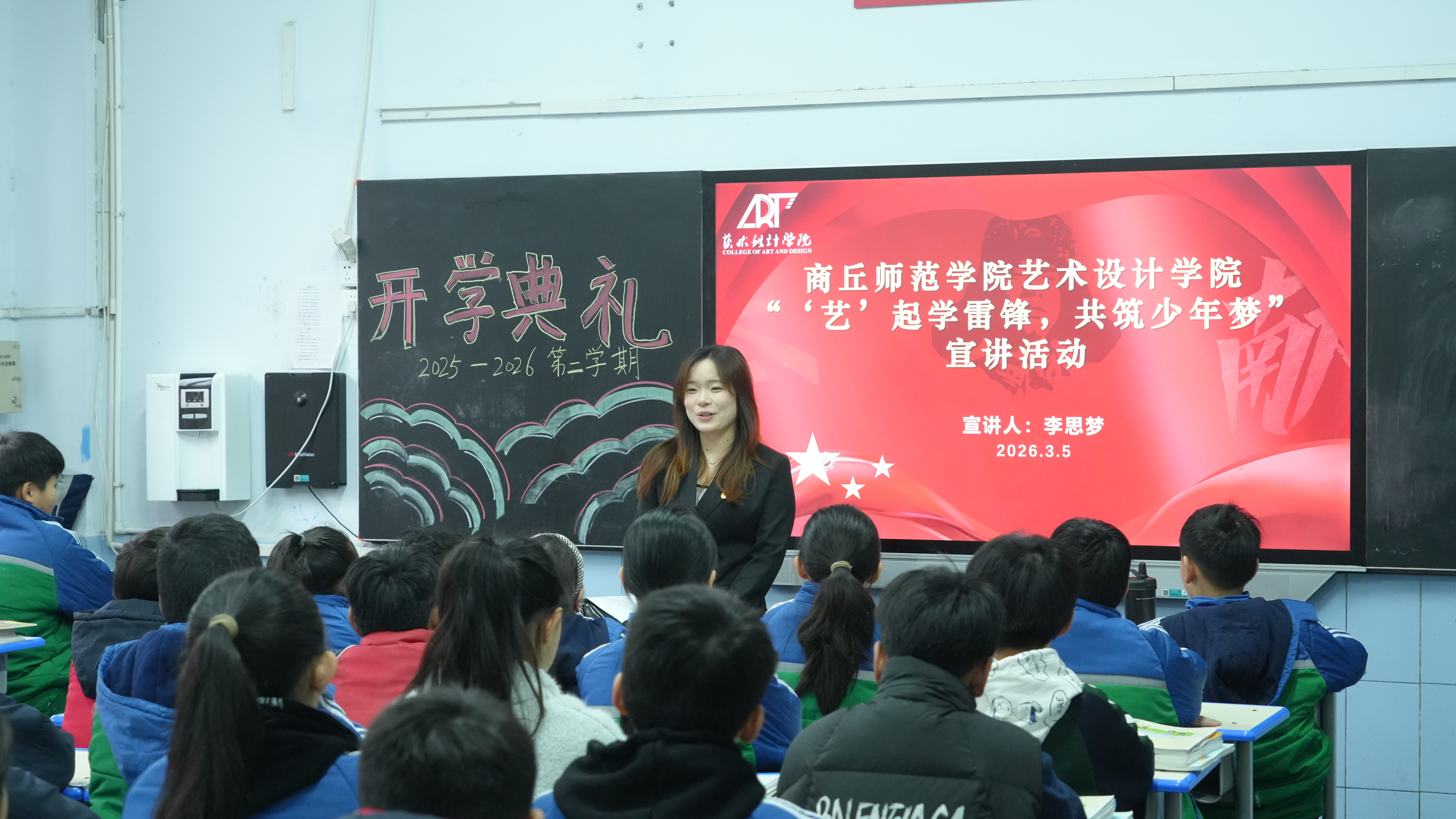 为深入学习贯彻党的二十届四中全会精神,探索高校与小学党建联创共建新模式,推动大中小学思想政治教育一体化建设,于3月5日学雷锋纪念日,艺术设计学院党委与商丘市民主路第二小学联合举办联创共建启动仪式暨“‘艺’起学雷锋 共筑少年梦”主题宣讲活动。艺术设计学院党委书记蒯秀丽、党建组织员王晓晓、支部书记韩翔、王春慧带领“艺”心向党宣讲团成员参加活动。
