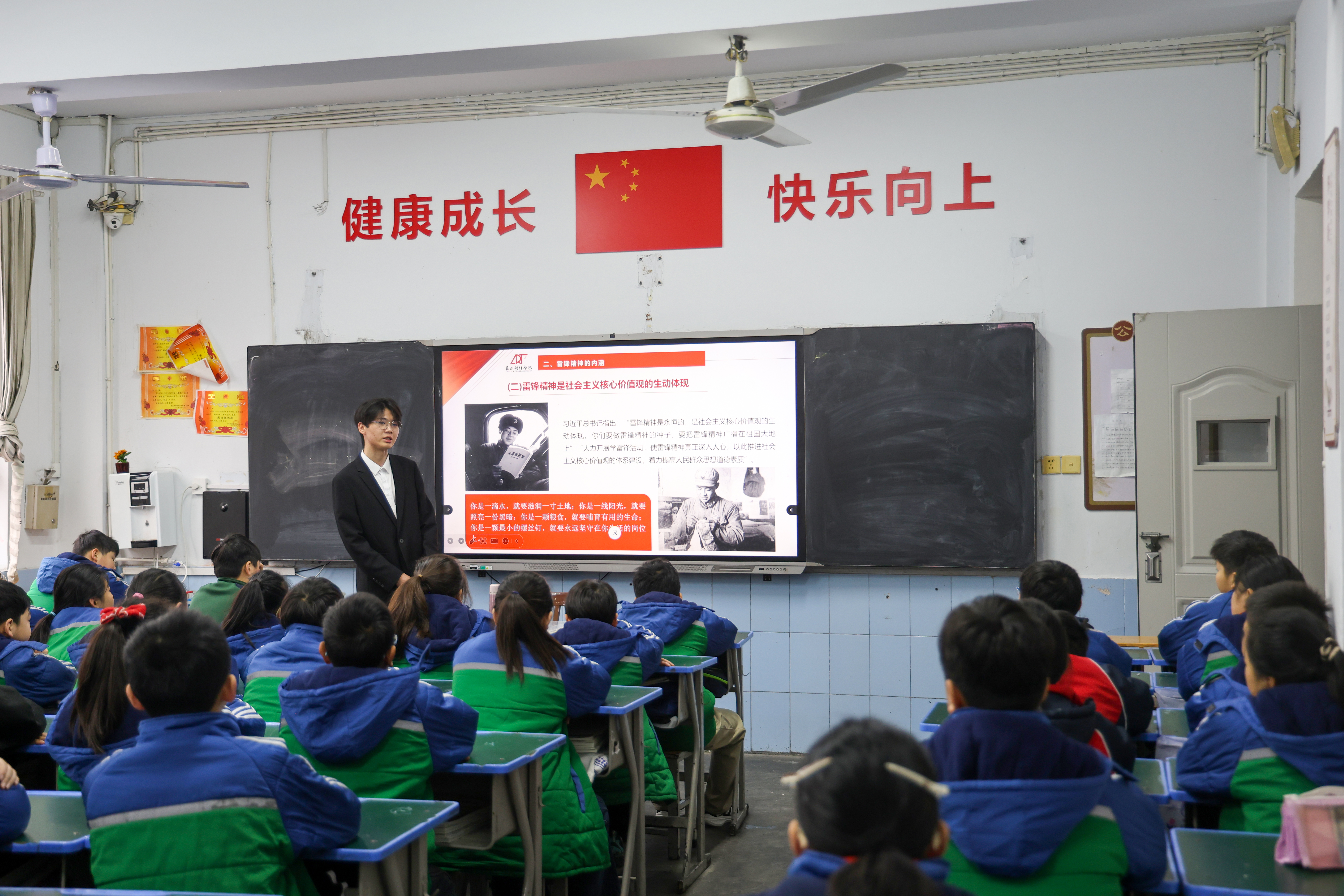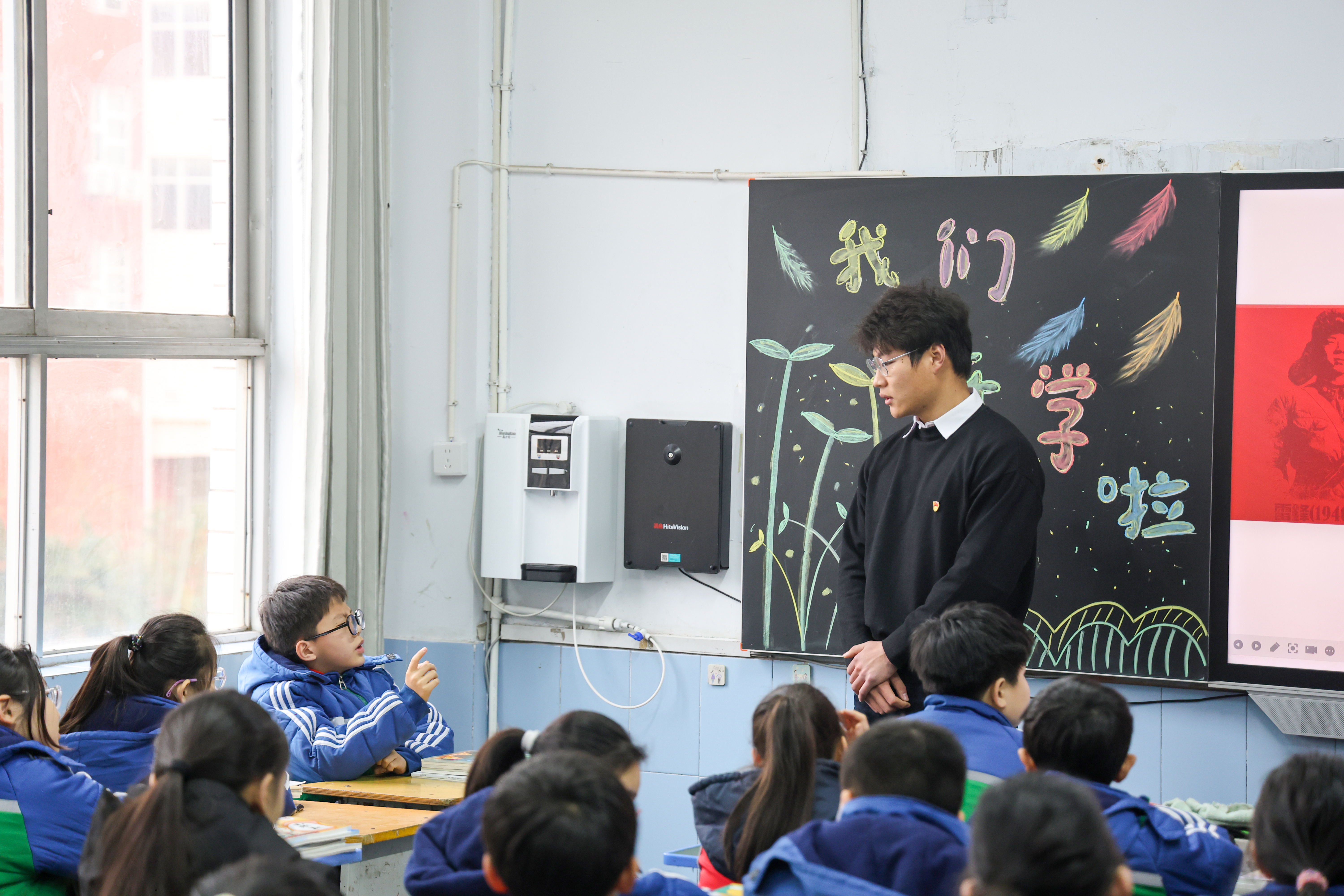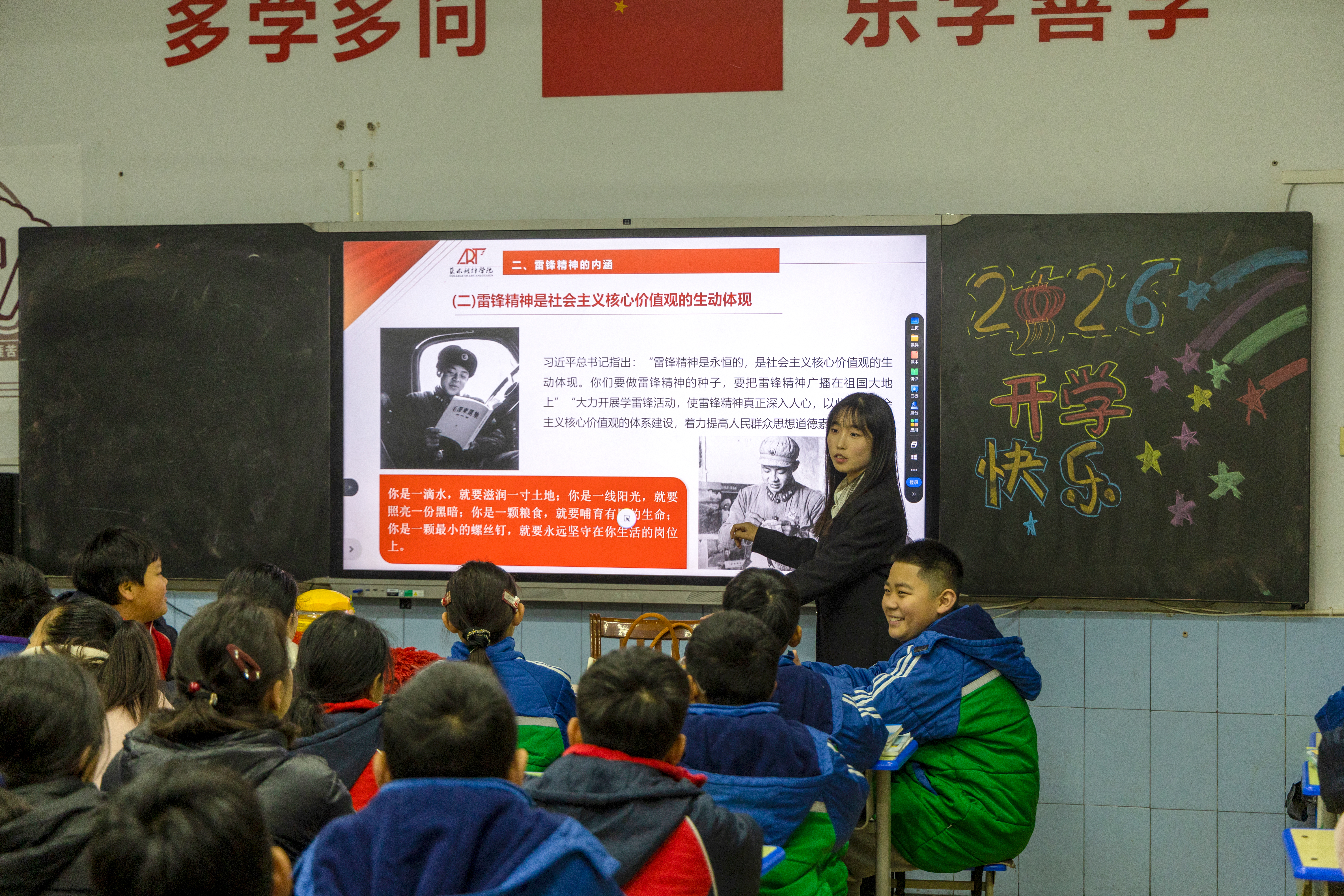 启动仪式后,“艺”心向党宣讲团成员为五年级学生带来“‘艺’起学雷锋 共筑少年梦”主题宣讲。宣讲团充分发挥艺术专业特长,以“讲、绘、唱、诵”沉浸式形式,将雷锋精神融入艺术表达:通过讲述雷锋故事传递奉献力量,指导学生绘制雷锋画像勾勒榜样形象,教唱雷锋歌曲激扬向上情怀,带领诵读雷锋日记厚植家国情怀。在“我身边的‘小雷锋’”互动环节,孩子们踊跃分享助人点滴,在童言稚语中感悟美德真谛,现场气氛热烈,掌声不断。