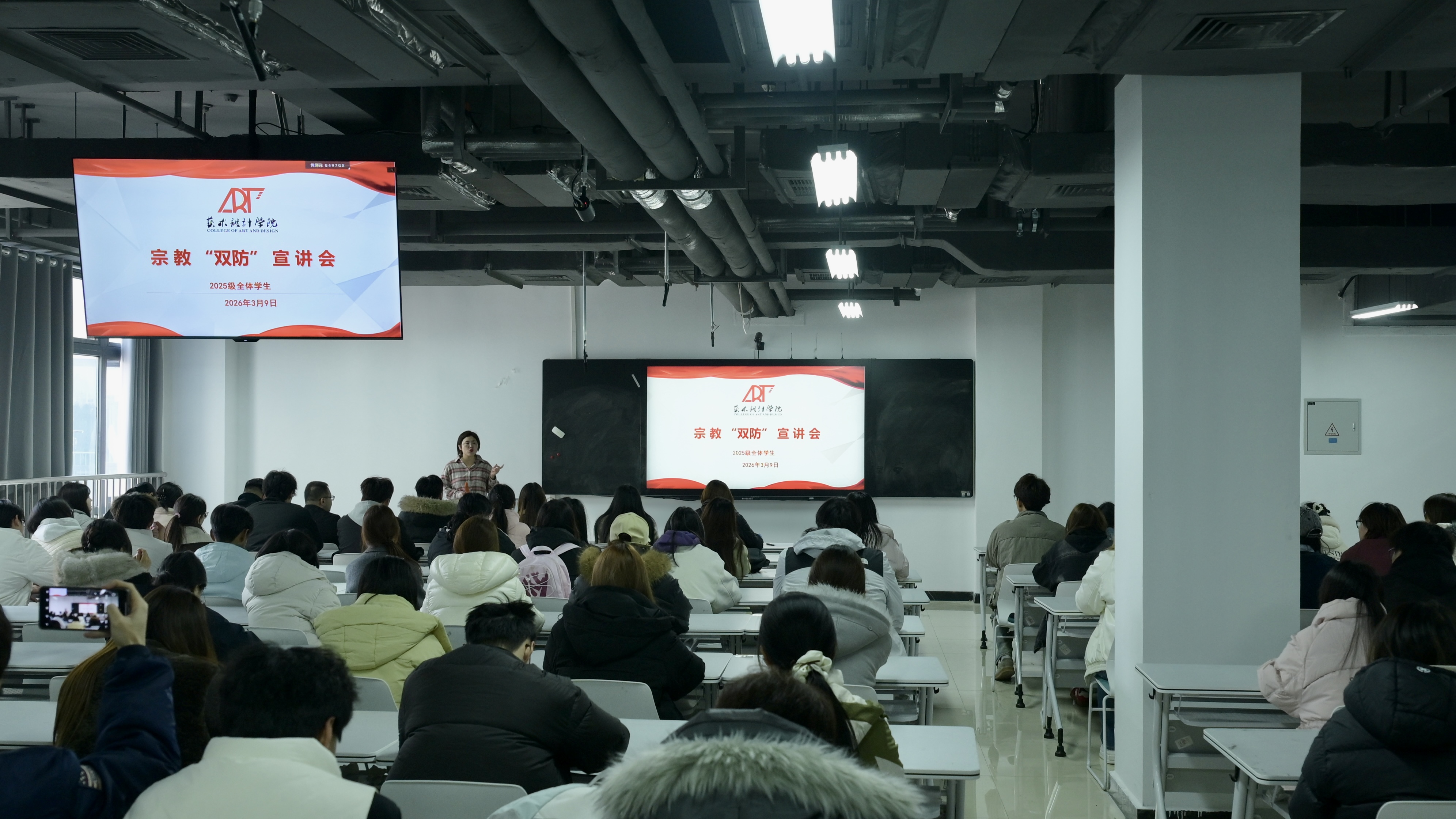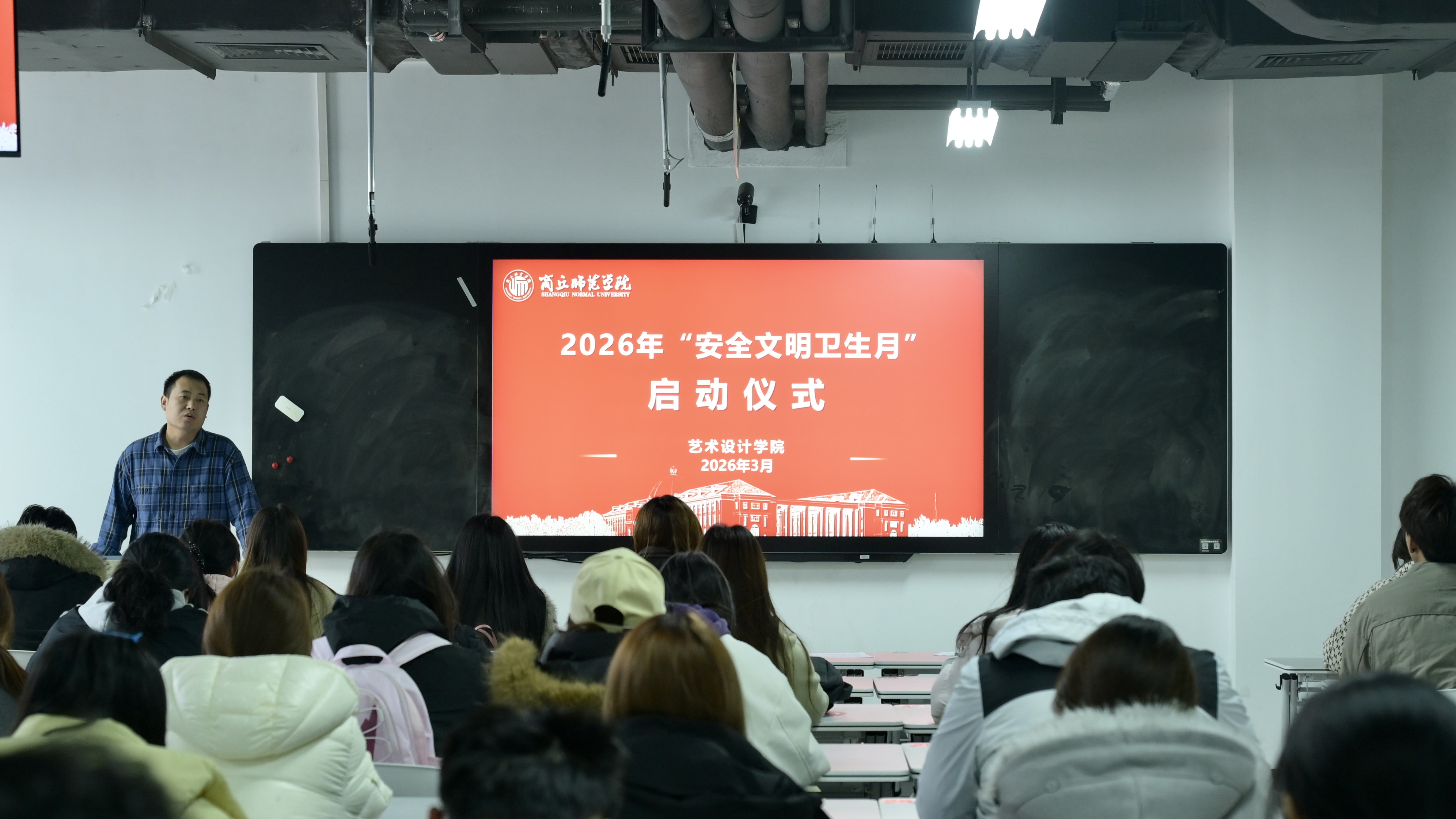 为深入推进校园安全文明建设,弘扬新时代雷锋精神与志愿服务精神,营造安全、文明、和谐的育人环境,3月6日,艺术设计学院在艺术中心321教室举行2026年“安全文明卫生月”暨“雷锋月”启动仪式。学院党委副书记侯双霞,辅导员张双力、袁瑞、王晓晓、韩翔、王春慧,学生会主席团成员、各年级班长及团支书、2025级宿舍舍长参加仪式。仪式由院团委书记袁瑞主持。